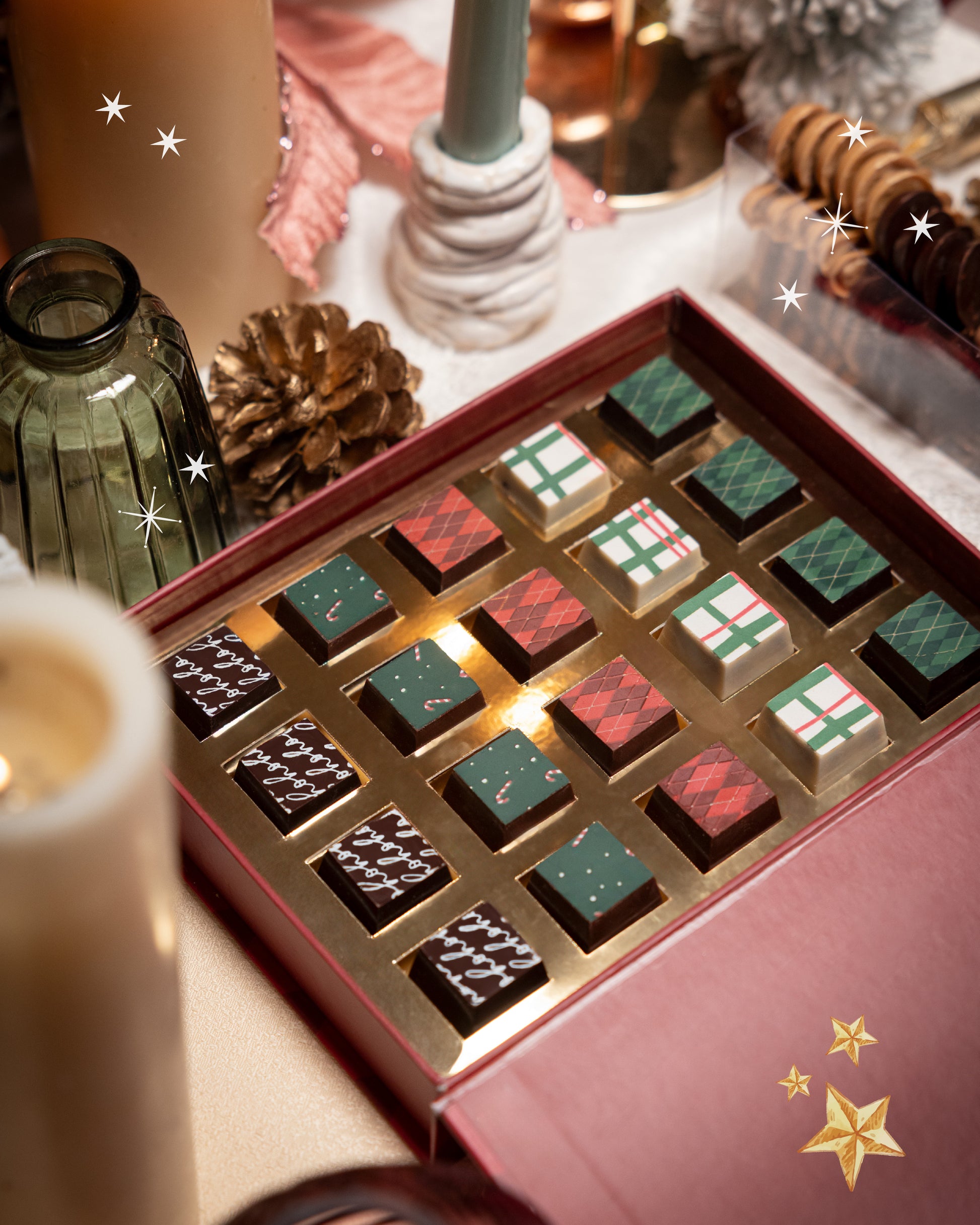 Flavors: Pistachio cream in milk chocolate, crème brulée in dark chocolate, Cheesecake raspberry in milk chocolate, coffee ganache in white chocolate, Hazelnut cream in dark chocolate
